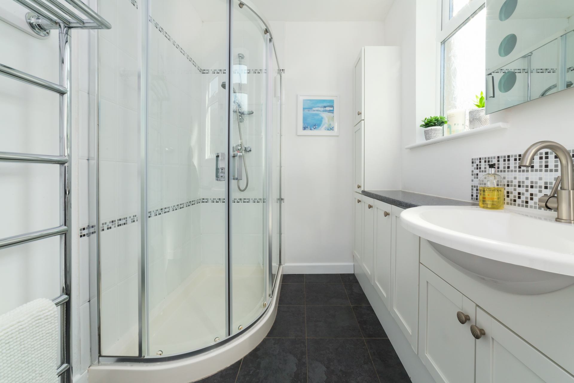 Family Bathroom: Walk in shower, WC, hand basin and mirror