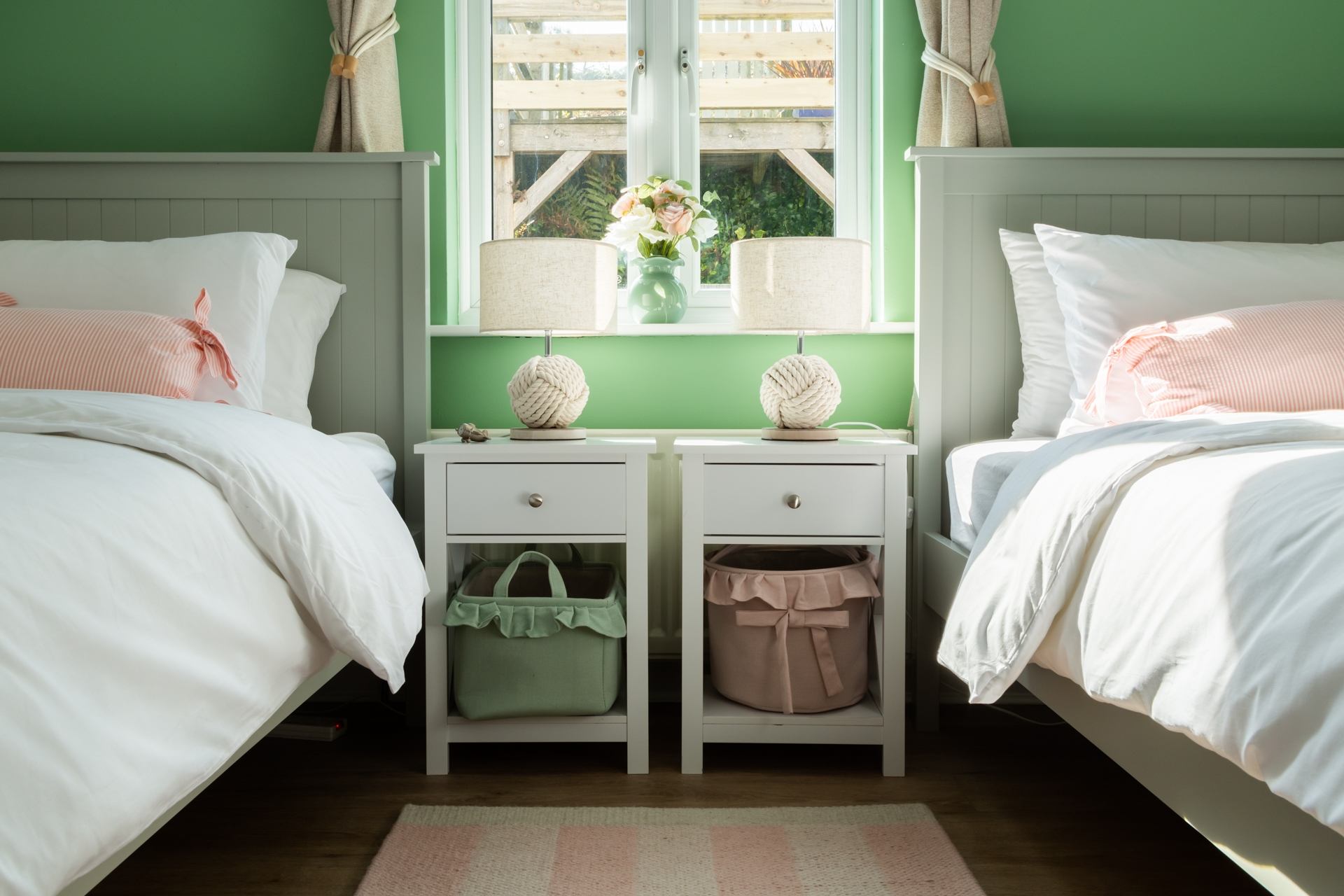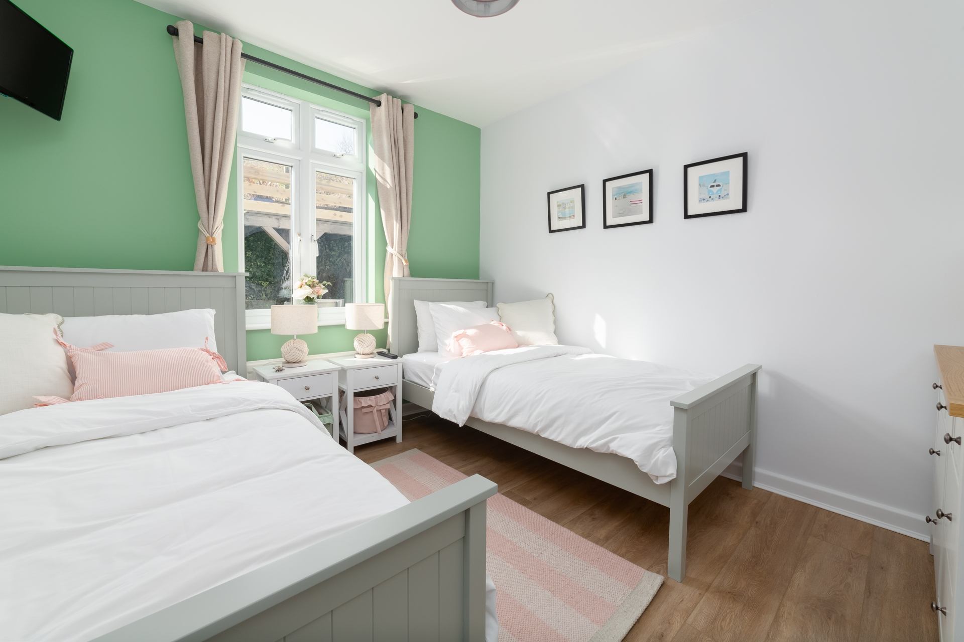 Bedroom 3: 2 x single beds, bedside tables with lamps, chest of draws, mirror, TV