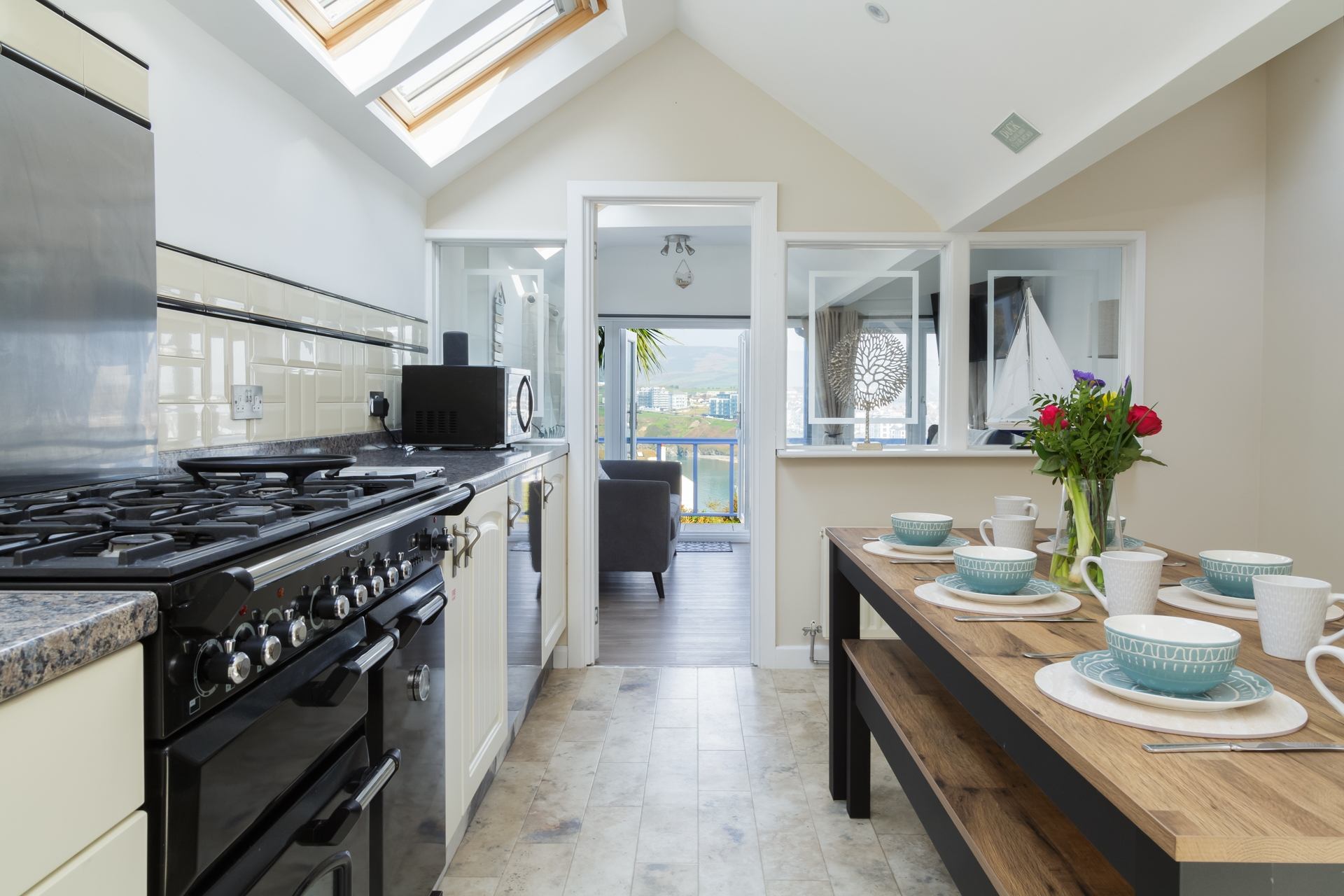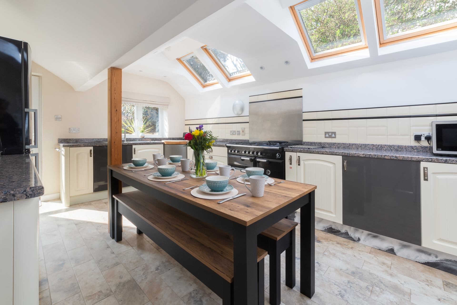 Kitchen Diner: Electric Oven, gas hob, fridge freezer, dishwasher, microwave, barista coffee machine, 6 person dining table with 2 bench seats
